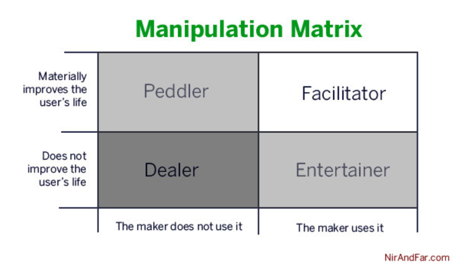 Kitabında bahsettiği “The Manipulation Matrix” — Manipülasyon Matrisi ile ise ürünlerin nasıl bir alışkanlık yarattığını sorgulatıyor. Ürün ve hizmetleri, insanların hayatında yarattığı etki ve değişime (bu ürün hayatımızı kolaylaştırıyor mu?) göre kategorize ediyor. Hem girişimcilere, hem yatırımcılara hem de çalışanlara yol gösterici olması için tasarladığı bu yöntem ile ürünün tüketici nezdinde değerini (gerçek marka değerini) ölçmeye çalışıyor Nir Eyal.